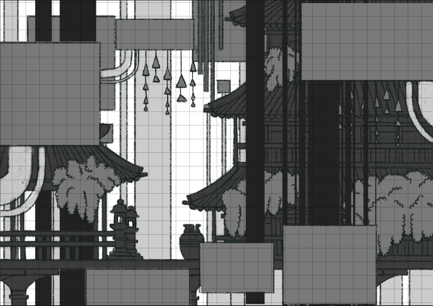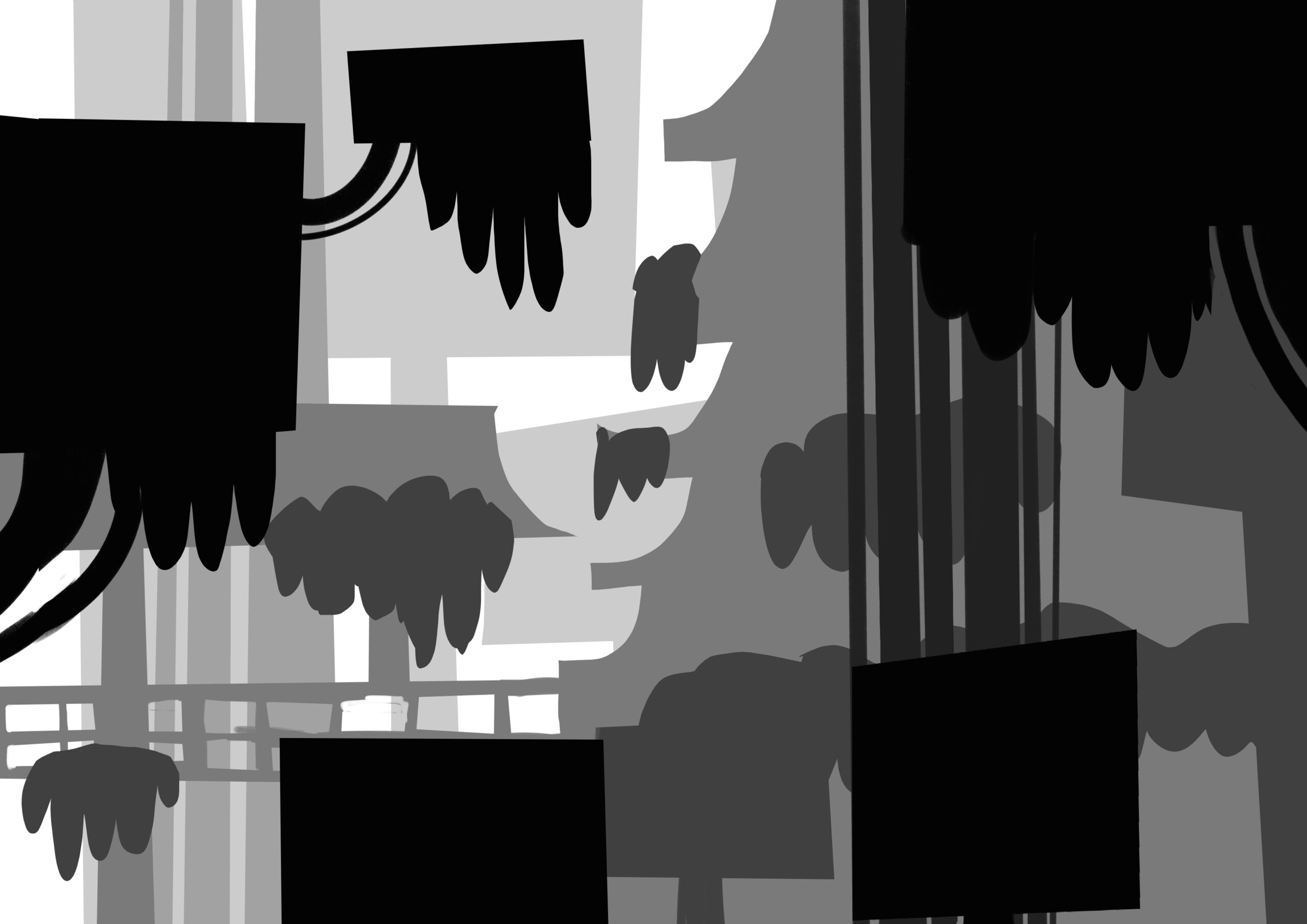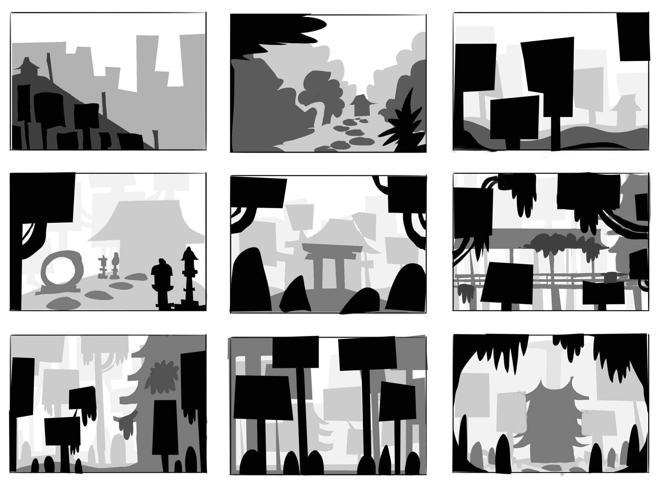 Dans un premier temps, j’ai fait des recherches de composition en créant plusieurs vignettes avec différents niveaux de gris.