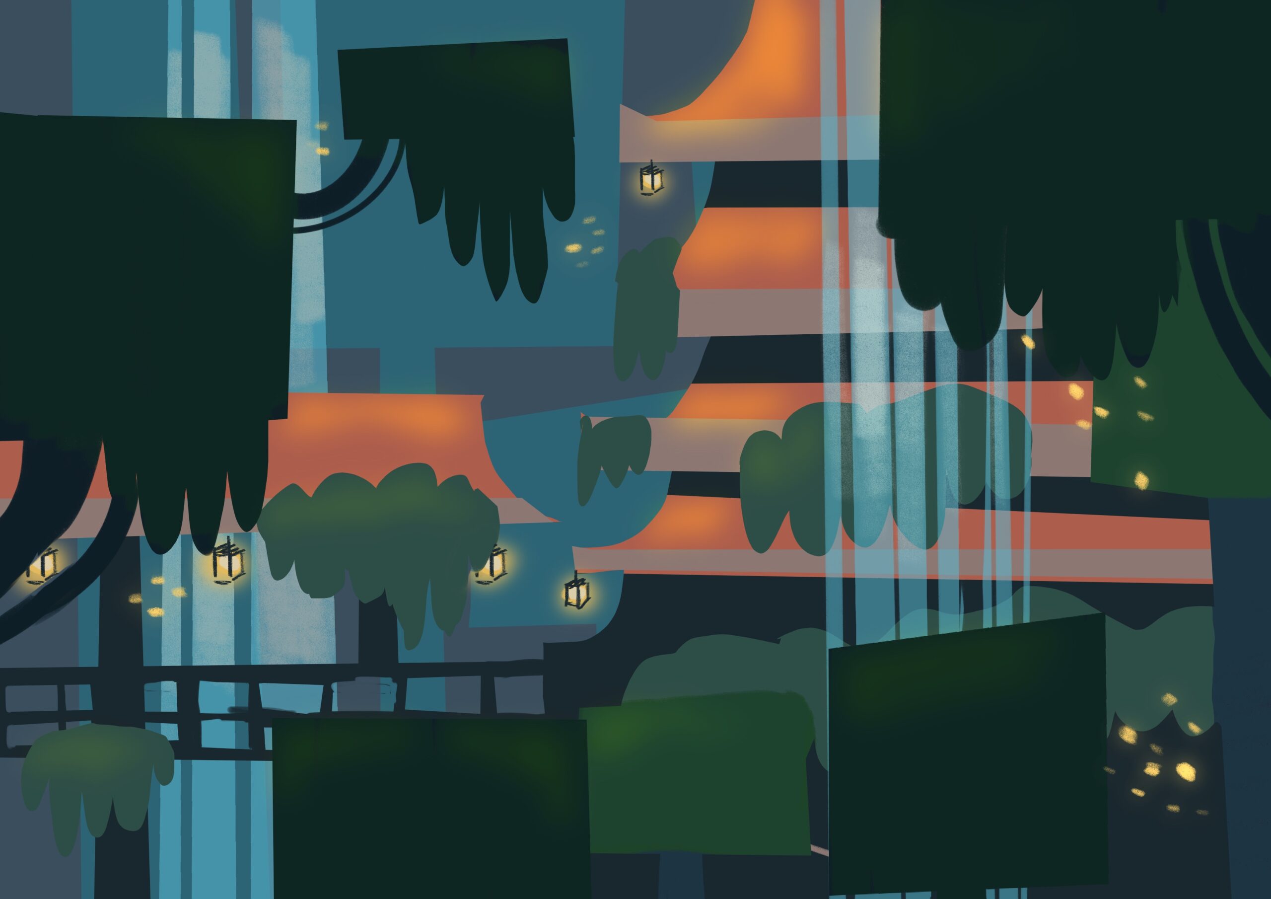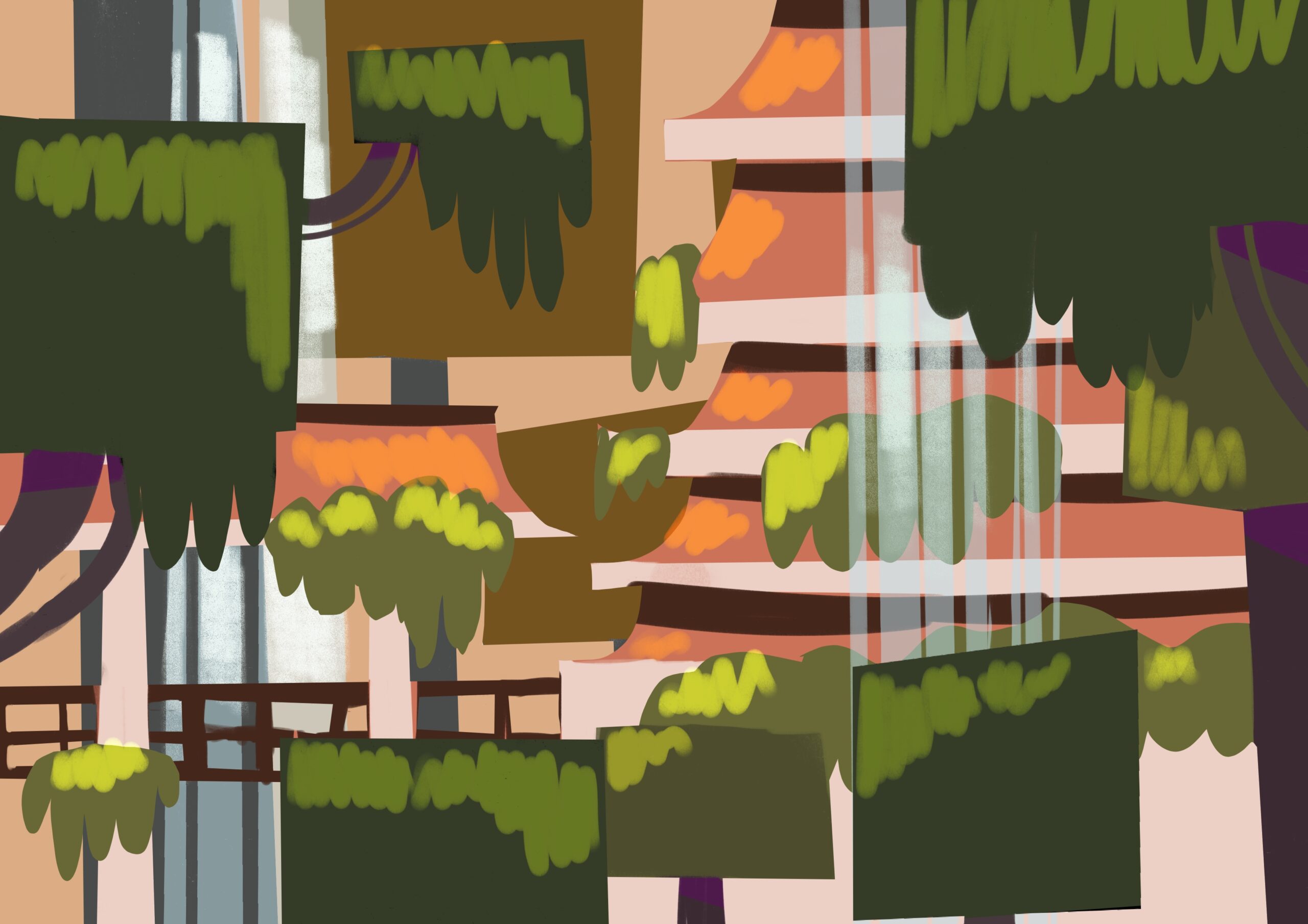 Mon choix s’est porté sur l’une des compositions que j’ai ensuite retravaillé pour mettre en valeur le temple, le sujet principal et j’ai rajouté des éléments pour correspondre au style graphique du jeu (ex : cascades).