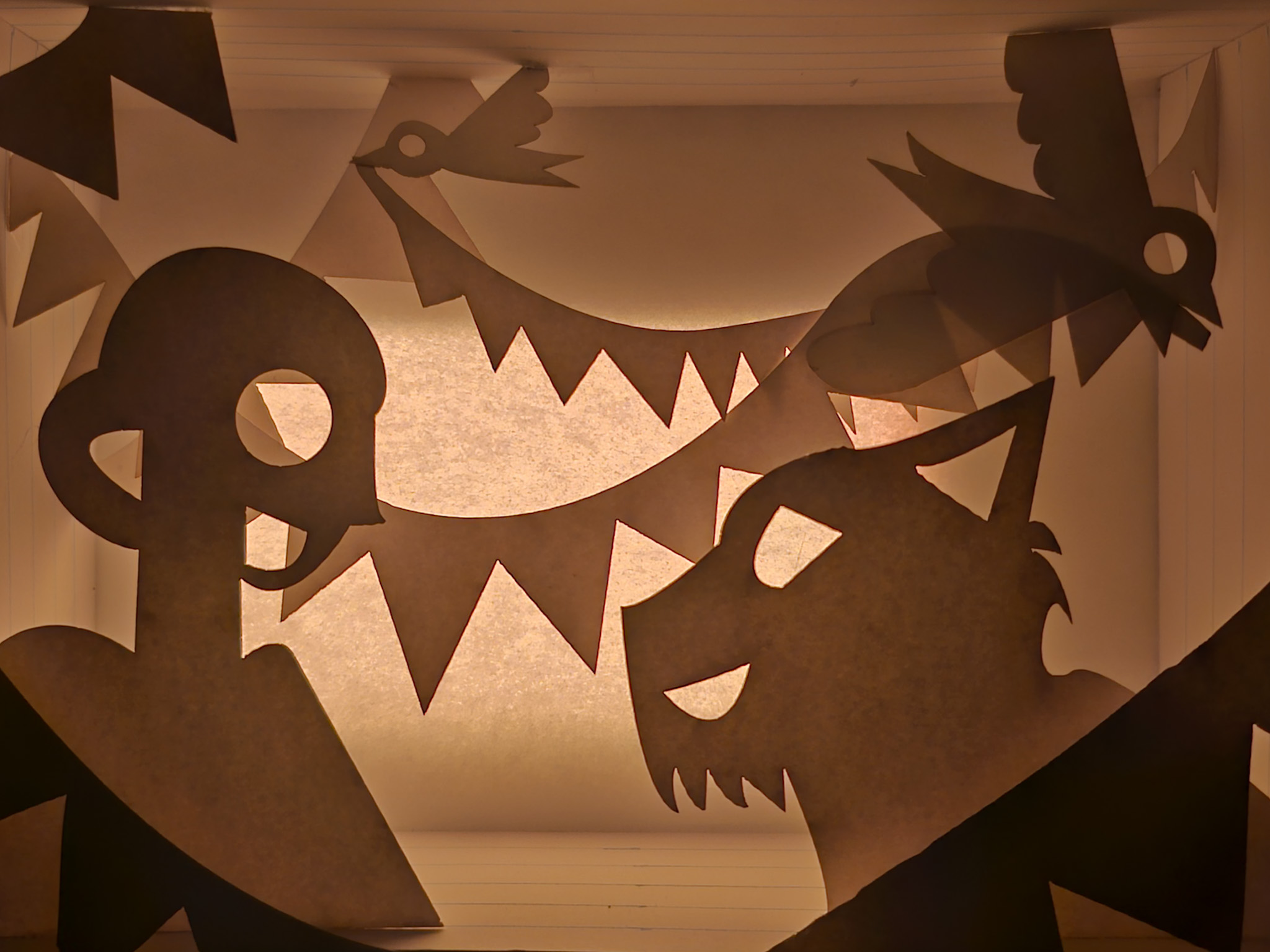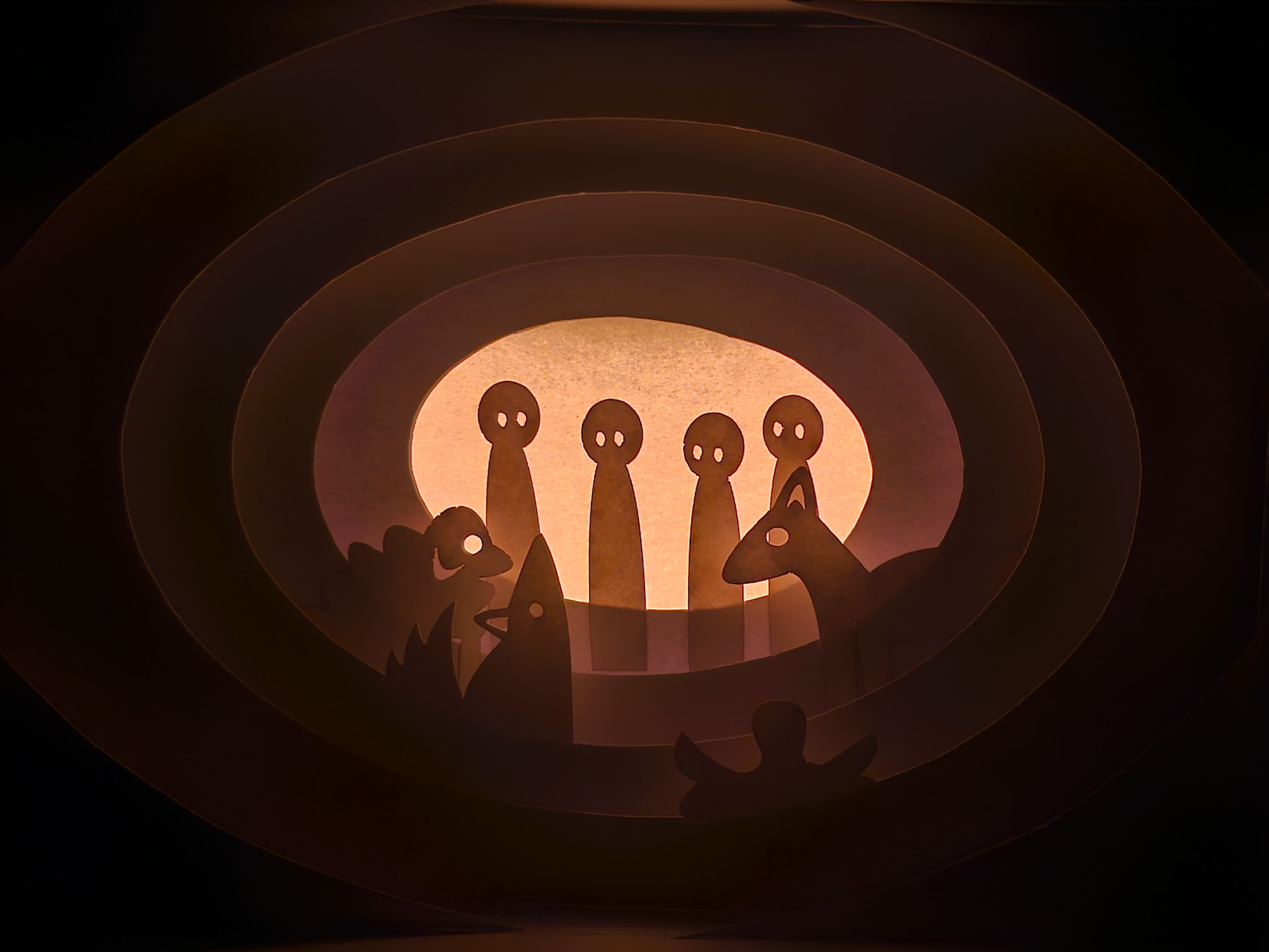 Ils préparèrent alors une grande fête, et les animaux les plus drôles vinrent du monde entier. Les hommes firent les clowns, racontèrent des histoires drôles. En les regardant, les animaux oublièrent qu’ils avaient soif, les enfants aussi.