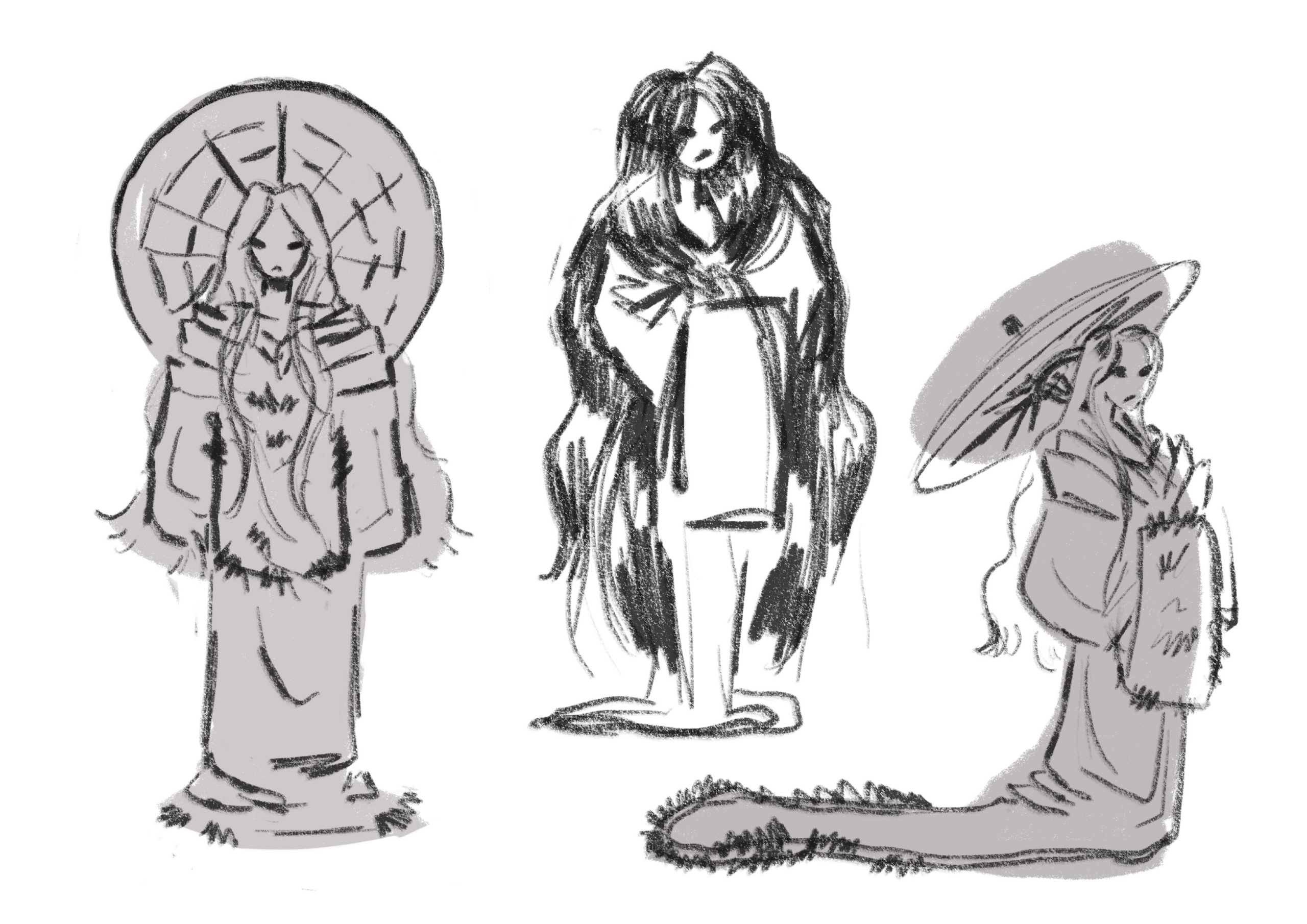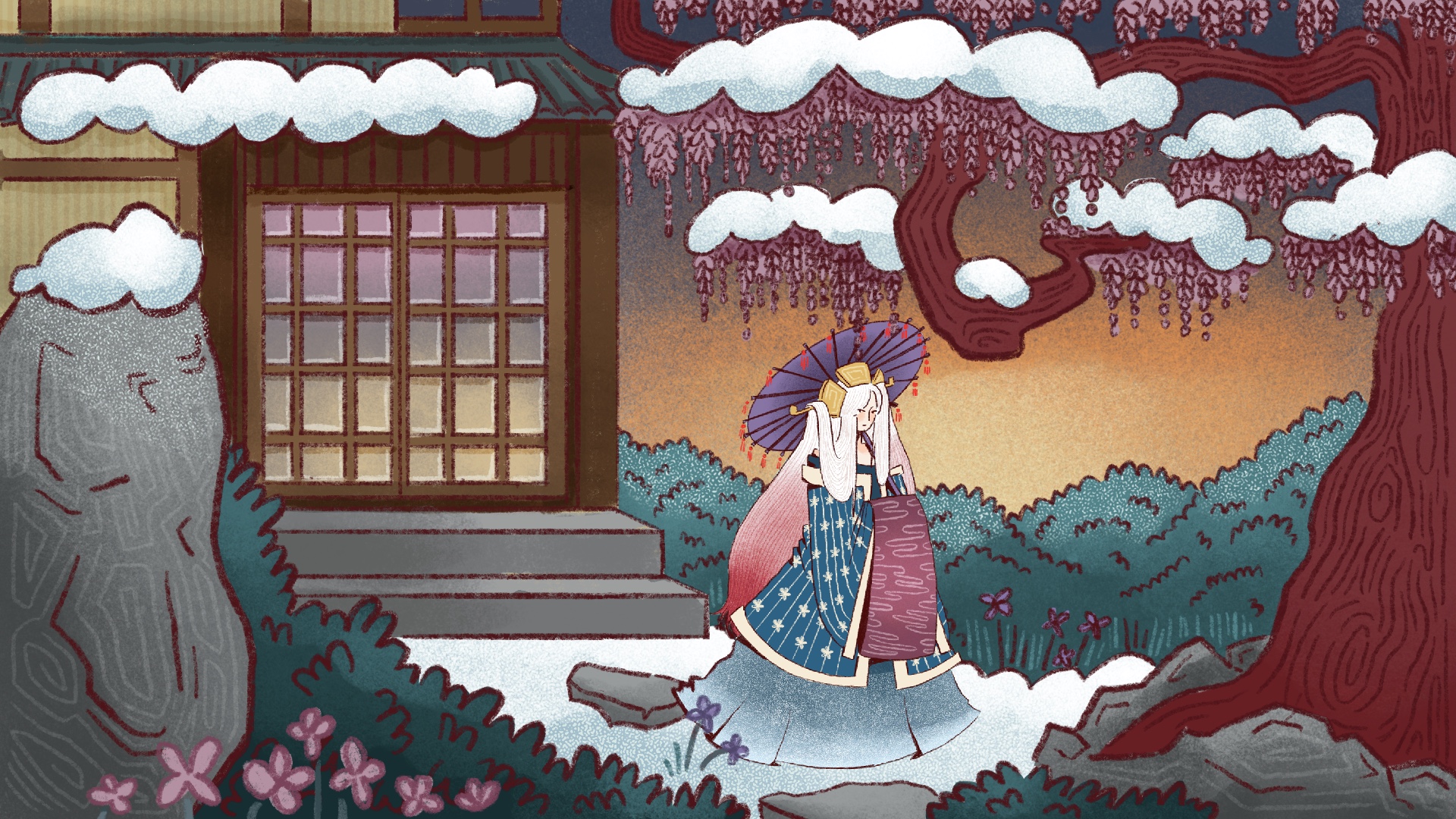 Je m’en suis inspirée pour créer une histoire fictive intégrant mon yōkai, Yuki-Onna, comme guide narratif, menant progressivement le récit vers la scène finale de ce parcours qui correspond au moment figé de l’estampe