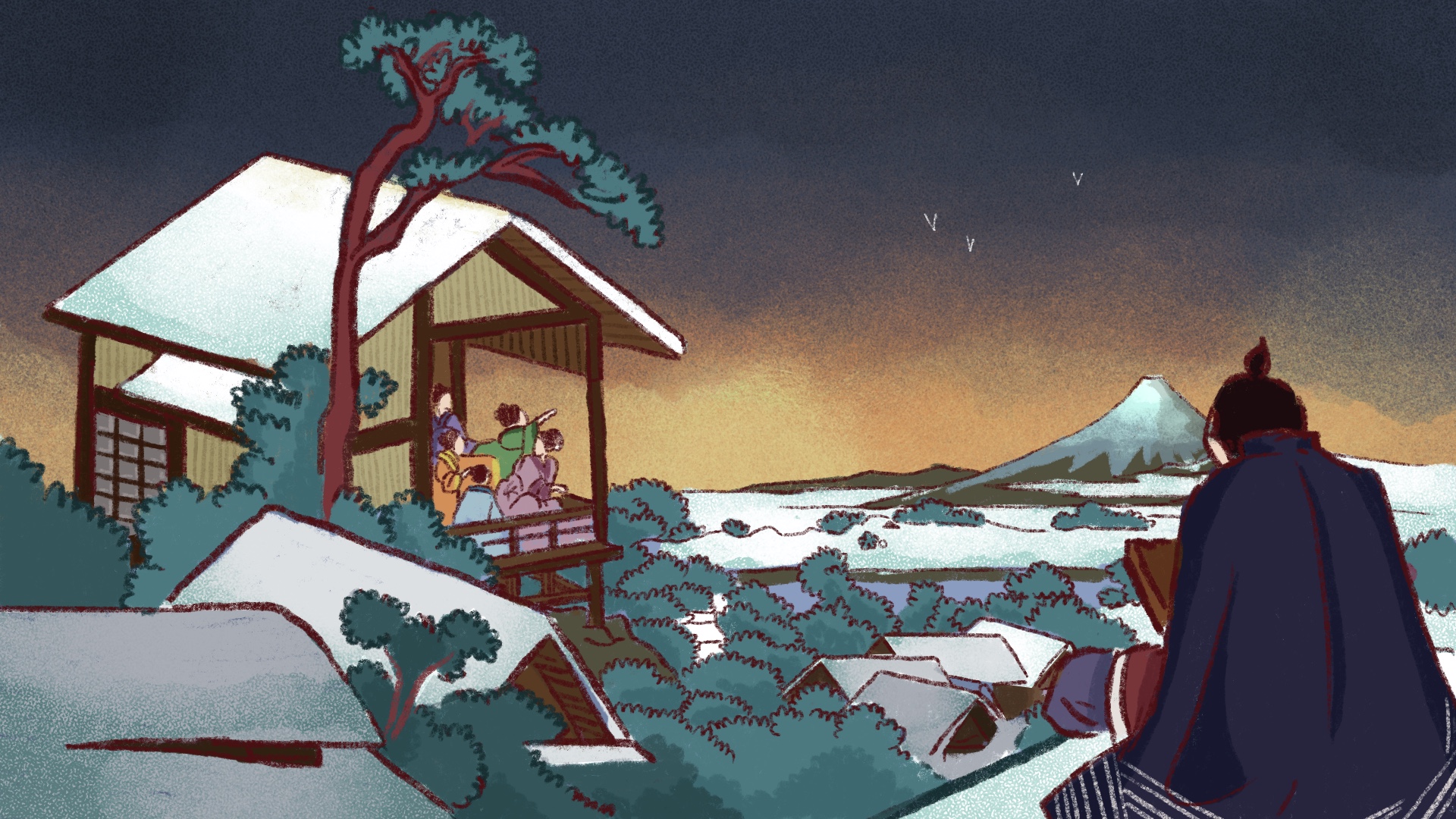 Pour ma part, j’ai choisi le thème des paysages. Afin d’introduire à la fois les techniques de création des estampes et les œuvres de la série des « 36 vues du mont Fuji », j’ai basé mon récit sur l’estampe d’Hokusai intitulée « Tea House at Koishikawa, The Morning After a Snowfall », issue de cette série.
